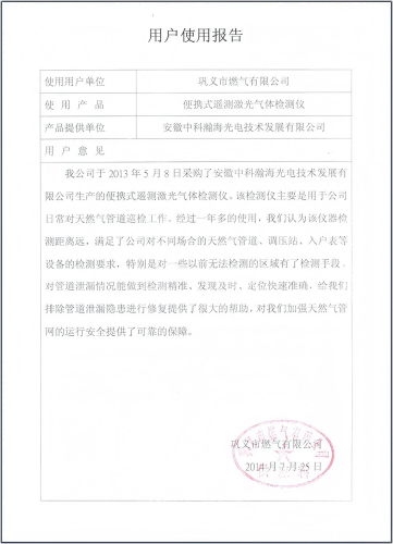 Gongyi Gas uses the portable telemetry laser methane detector produced by Hanhai Opto-electronic for the company's daily inspection of natural gas pipelines. The instrument has a long detection distance, which meets the company's detection requirements for equipment such as natural gas pipelines, pressure regulating stations, and home meters in different occasions, especially for areas that could not be detected before. The pipeline leakage can be accurately detected, found in time, and quickly and accurately positioned. It has provided great help to eliminate hidden dangers of pipeline leakage and repaired, and provided a reliable guarantee for the company to strengthen the operational safety of the natural gas pipeline network.