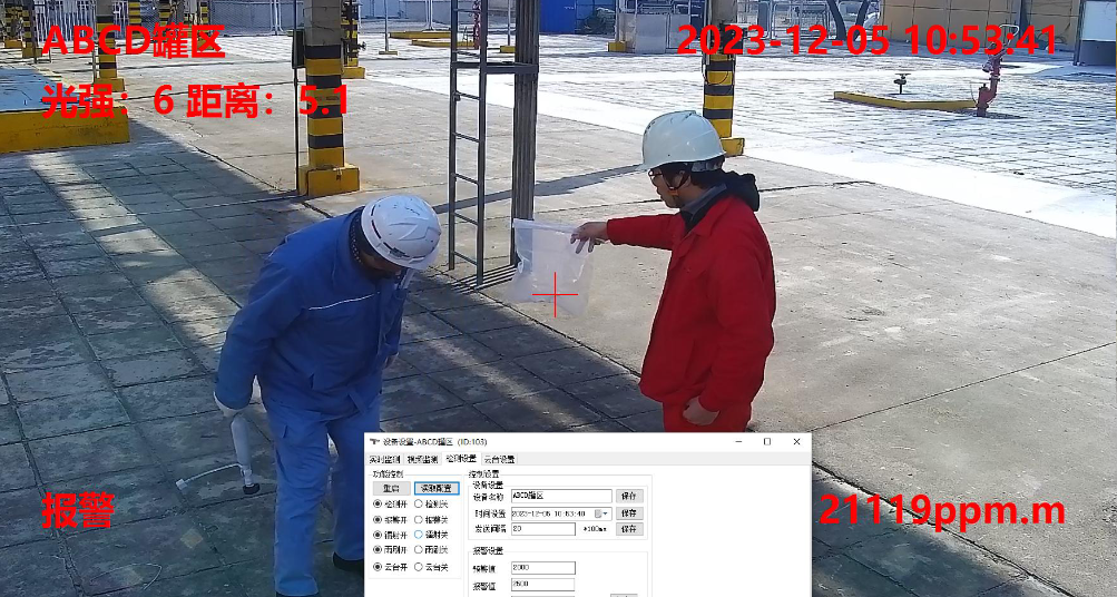 In the ABCD tank farm, at the moment of simulated leakage, the device immediately displayed a concentration value of 21119 ppm·m, and the alarm was triggered in only 0.3 seconds;